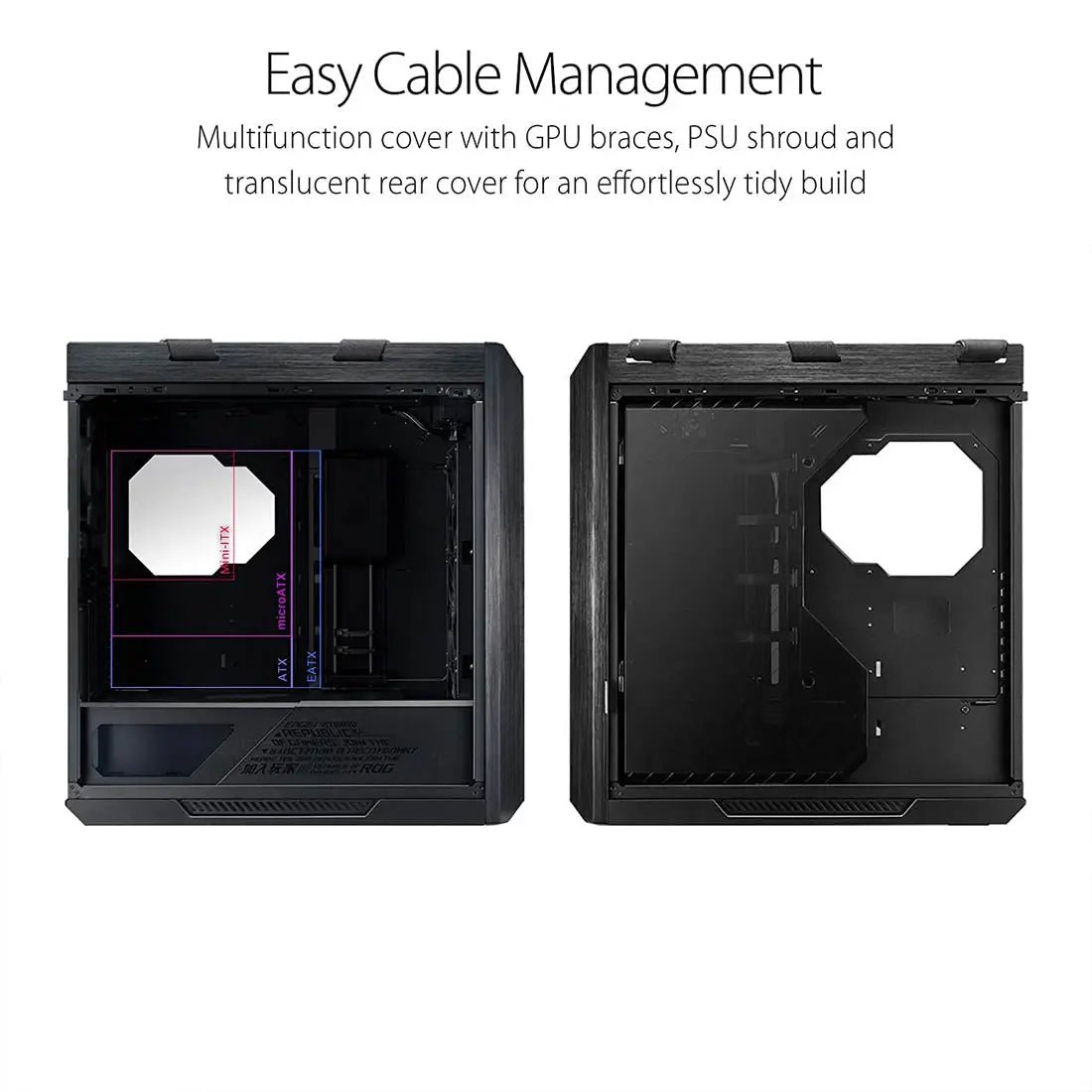 The flexible two-piece PSU shroud has a front cut-out to enable compatibility with ROG Thor or other OLED-integrated power supplies.