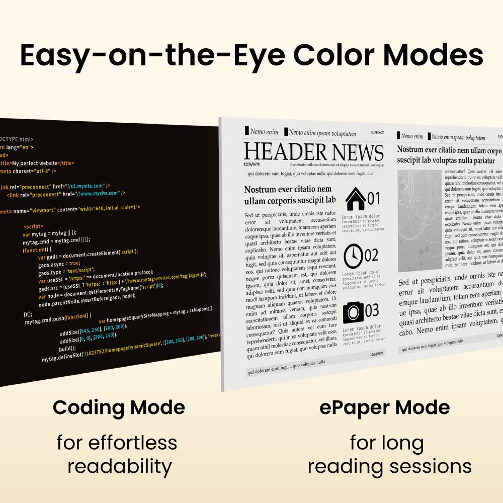 Features like Coding Mode, ePaper Mode, and Color Weakness Mode adapt the display for specific tasks, improving readability and accessibility for diverse user needs.